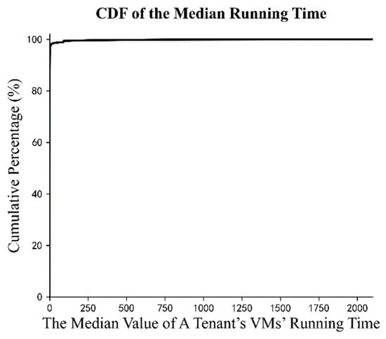 As mentioned above, we extract three features to represent the behavior patterns of tenants. The problem is that all features possess uneven distributions. Take for example. Figure 3 shows the cumulative distribution of the median value of the running time of a tenant’s VMs. It suggests that when discussing the median running time, a tiny number of the tenants can reach up to more than 2000 days, while the large majority, accounting for over 95 percent of the tenants, are finished in only a few days. Not only with the median running time, but the other two features also present a similar skewed distribution. This results in a considerable number of tenants being compressed together after normalization. Therefore, it is hard or even impossible to obtain satisfactory clustering results through the one-time clustering method.