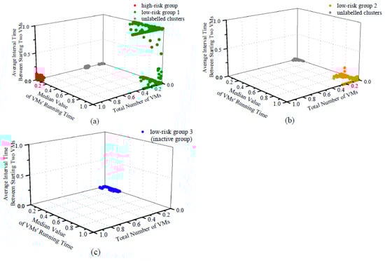After the three clusterings, we successfully obtain four groups: high-risk group, low-risk group 1, low-risk group 2, and low-risk group 3 (inactive group). The high-risk group hosts the potential attackers, and the low-risk tenants are divided into three groups with increasing security levels. Low-risk group 3, also named the inactive group, represents the vast majority part of tenants existing on cloud platforms. Low-risk group 1 and low-risk group 2 are also normal tenants but possess different behavior patterns from the majority, so they are considered to have higher security levels. Note that in the clustering task, we do not simply classify the unlabeled tenants as medium-risk since such action will roughly put tenants who present other groups’ patterns into the medium-risk group. Consequently, we allow them to enter the classifier just like any tenant who newly arrives. Only when they still fail to be classified into any groups the second time can they be labeled as medium-risk.