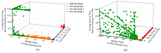 The overall clustering result is shown in Figure 8 and Table 3. Figure 8a shows the result after normalization and Figure 8b shows the result before normalization. Table 3 shows the number of tenants in each group. The total number of tenants is 141,336, and the number of labeled tenants is 103,314. The percentage of the labeled tenants is 73.10%. Compared with the traditional one-time clustering, the proposed multi-level clustering method is capable of discovering more detailed groups under the unevenly distributed dataset. Cloud providers are allowed to flexibly group tenants by adjusting the minimum cluster size of each clustering.