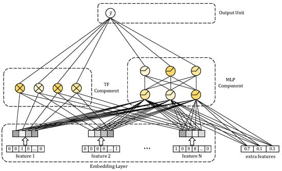 Various methods to automatically learn feature interactions have been proposed. These methods can be seen as combinations of several models that learn different feature interactions. FM [,] can be viewed as a combination of linear regression and second-order factorization methods. Wide & Deep Learning [] combines linear regression and MLP. This combination allows the model to simultaneously learn first-order and higher-order feature interactions. An improved version of Wide & Deep Learning, which shares the embedding space and shows good performance in regression analysis, was proposed in [].