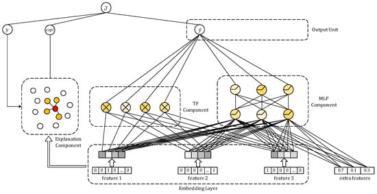 Recent advancements in machine learning have introduced methods capable of automatically analyzing data characteristics [,,]. These methods reduce the user’s effort in data analysis and feature engineering. They do this by learning multiple feature interactions simultaneously, offering remarkable performance. However, these methods are often unsuitable for handling multi-dimensional tensors. They can only learn limited orders of feature interactions. Additionally, they lack the capability to explain why certain items were recommended.