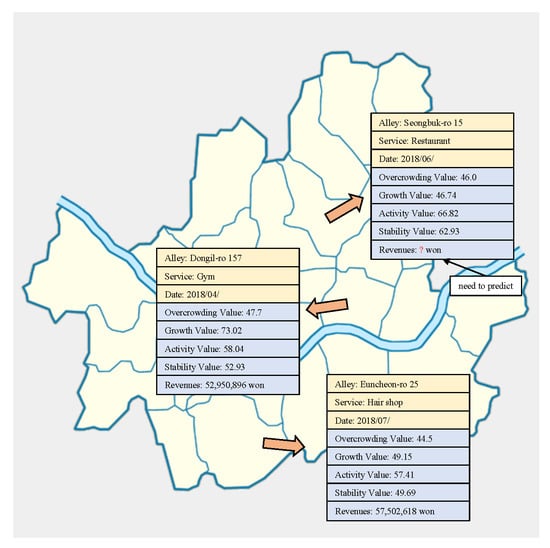 We construct a three-dimensional tensor using alley name, service name, and date. We use overcrowding value, activity value, growth value, and stability value as extra features. Figure 4 shows the map of Seoul and examples of data points.