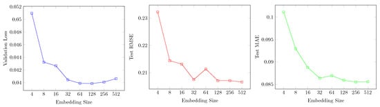 Figure 5 shows the changes in validation loss, test RMSE, and test MAE for different embedding sizes. When the embedding size exceeds 128, there are no significant changes in test RMSE and test MAE, but validation loss increases. Therefore, the optimal embedding size in our case is 128.