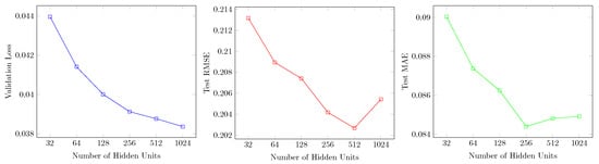 Changes in validation loss, test RMSE, and test MAE for different numbers of hidden units.