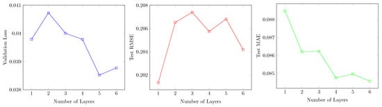 Figure 7 shows the changes in validation loss, test RMSE, and test MAE for different numbers of layers. The validation loss and test RMSE show the best performance when the number of layers is 1. Performance generally improves as the number of layers increases, except when there is only 1 layer. Further study is required to understand why these results occurred.