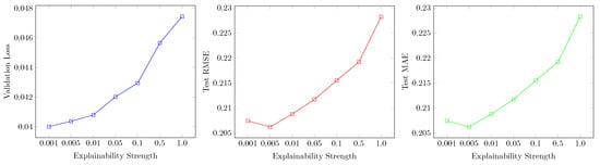 Changes in validation loss, test RMSE, and test MAE for different explainability strengths.