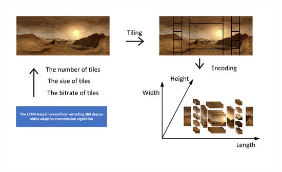 To address the aforementioned challenges, this paper proposes a non-uniform three-dimensional encoding scheme. Specifically, the video is divided into tiles of different sizes, with the tile sizes being related to the user’s attention mechanism and the distance between the user’s eyes and the screen. Based on this, different quality levels of video are allocated to each tile. Subsequently, this paper proposes a 360-degree adaptive transmission architecture based on non-uniform three-dimensional encoding, introduces a new QoE evaluation parameter, and digitally models the video transmission process to summarize the optimization problems that need to be addressed. Finally, a dual-layer stacked LSTM network (DLS-LSTM) is proposed to predict the number of tiles, the size of each tile, and the bitrate of the video transmitted for each tile at the next moment based on the current network bandwidth, the distance between the user’s eyes and the screen, and the server’s 360-degree video data. This paper constructs and labels a dataset of users watching 360-degree videos, simulates the scenario of users watching 360-degree videos based on existing wireless cellular network data, and uses exhaustive algorithms to calculate the optimal tile segmentation scheme and tile bitrate allocation scheme. Based on the dataset, a model for tile segmentation and bitrate allocation is trained and obtained.