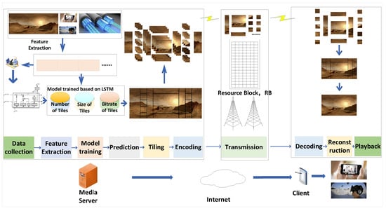 With the development of network technology, the proportion of video traffic in global mobile internet traffic is increasing. A 360-degree video allows users to have an immersive experience while watching videos. This form of video has become increasingly popular, enabling users to obtain 360-degree video content around them by wearing VR headsets or holding mobile phones, and switching their viewing perspectives by turning their heads or rotating their devices. This feature of 360-degree video also results in a significantly larger encoding volume. For example, transmitting a 4K resolution 120-frame 360-degree video requires up to 4.2 Gbps of network bandwidth []. Therefore, 360-degree video transmission requires a higher network bandwidth compared to traditional 2D video transmission []. The spatial and temporal distributions of wireless resources in cellular networks are uneven, making it difficult to ensure a consistent user experience when watching videos. This issue becomes particularly severe when a large number of users simultaneously access the wireless cellular network, leading to unstable media experiences. Consequently, optimizing the transmission of a 360-degree video over wireless networks presents a significant challenge.