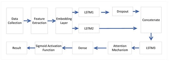 As shown in Figure 3, the collected data first undergo preprocessing for feature extraction and are then passed to the embedding layer for format conversion. Subsequently, the data are fed into two separate LSTM networks. The first LSTM network incorporates Dropout to randomly discard some neurons, thereby reducing the complexity of the neural network and preventing overfitting. After this, the data enter the concatenate layer, where the feature values are merged and then processed by a third LSTM network. This network further refines the feature values, providing a deeper analysis for the final result. Following the third LSTM network, an attention mechanism is introduced to dynamically adjust the weights of different parts, thereby modifying the input features. Finally, the data are input into the dense layer, where the sigmoid activation function is applied to predict the optimization target.
