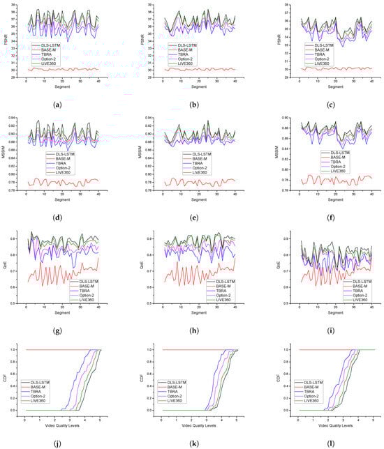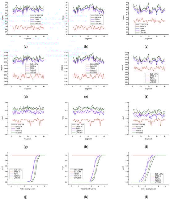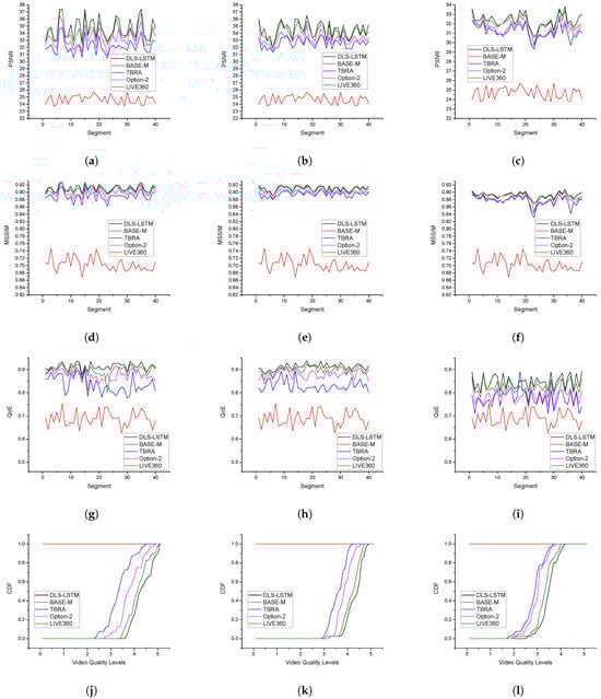The algorithm performance for user-watched video streaming of Lion under different network conditions. (a) PSNR (S-Network). (b) PSNR (SM-Network). (c) PSNR (FM-Network). (d) MSSIM (S-Network). (e) MSSIM (SM-Network). (f) MSSIM (FM-Network). (g) QoE (S-Network). (h) QoE (SM-Network). (i) QoE (FM-Network). (j) CDF (S-Network). (k) CDF (SM-Network). (l) CDF (FM-Network).