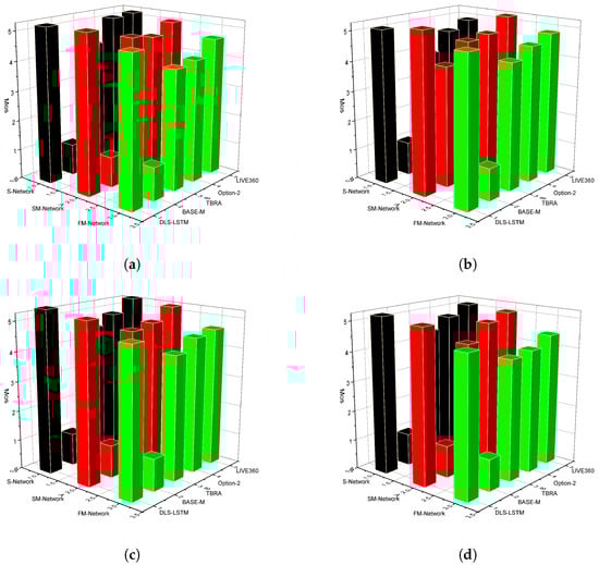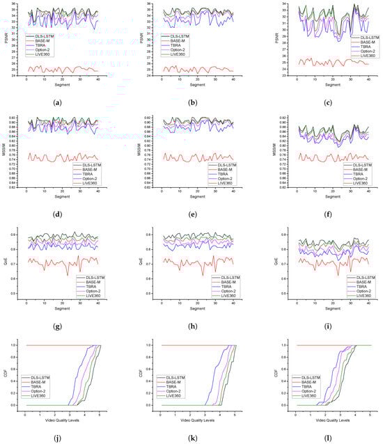 Figure 8 shows the results of the subjective quality evaluation experiment conducted in this study. The experiment demonstrates that the proposed DLS-LSTM method achieves the highest MOS scores across all network conditions and for all videos viewed by users. This result also confirms the accuracy of the QoE definition proposed in this paper. The BASE-M algorithm receives the lowest subjective evaluation from users because it only transmits video data at the lowest quality level.