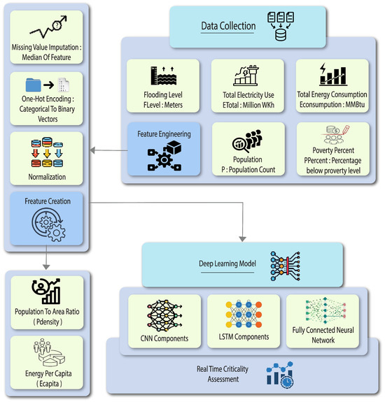 We increased the critical assessment associated with geographic zones in smart cities by means of a new deep learning architecture that integrates multiple neural network components. This would point to spatial and temporal dynamics of infrastructure resilience as a key element to enhance the model’s ability to learn complex relationships with improved accuracy and reliability of predictions from data. Figure 1 presents the comprehensive flow, from data collection and preprocessing to the implementation of the deep learning model, highlighting the various stages such as feature engineering, CNN components, LSTM components, and the fully connected neural network leading to real-time criticality assessment. The process begins with data collection from various sources, capturing key variables such as Flooding Level, Total Electricity Use, Total Energy Consumption, Population, and Poverty Percent. The collected data undergoes preprocessing steps, including missing value imputation, one-hot encoding for categorical variables, and normalization. Feature engineering follows, where new features like Population to Area Ratio (Pdensity) and Energy Per Capita (Ecapita) are created to enhance the model’s predictive power.