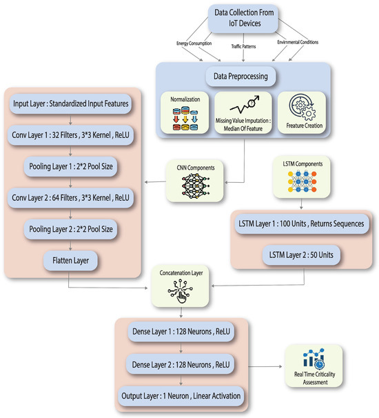 Figure 2 presents the proposed deep learning architecture for critical assessment in smart cities. The whole process starts from the collection of data, where energy consumption, traffic patterns, and environmental conditions are some of the metrics collected from IoT devices installed at various points in the city. Following this, normalization, filling of missing values through the median of each respective feature, and feature creation are some preprocessing steps involved in collecting the data to make the dataset more informative. The CNN component processes the standardized input features through multiple convolutional layers (with 32 and 64 filters) followed by pooling layers to extract the spatial features. Concurrently, the LSTM component captures temporal dependencies through two layers, one with 100 units returning sequences and another with 50 units. The outputs from the CNN and LSTM components are concatenated and passed through dense layers, ultimately producing a real-time criticality assessment.