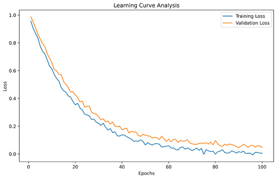The learning curve analysis is crucial for understanding the training dynamics of the proposed model. Figure 4 illustrates the training and validation loss over 100 epochs for our proposed approach. The training loss decreases steadily, indicating effective learning. The validation loss also decreases and stabilizes, suggesting that the model generalizes unseen data well without overfitting.