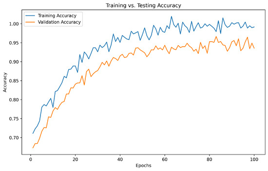 The comparison between training and testing loss is crucial for understanding the model’s ability to generalize and avoid overfitting. Figure 6 illustrates the training and testing loss over 100 epochs for our proposed approach. The graph shows a consistent decrease in both training and testing loss, with the training loss reaching a lower value compared with the testing loss, indicating effective learning and generalization.