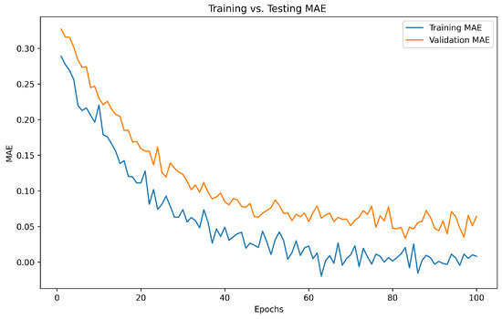 Training vs. testing MAE over 100 epochs.