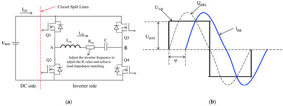Figure 2b shows a schematic diagram of the waveforms associated with the circuit. UAB is the inverter voltage between points A and B. UAB1 is the fundamental component of the inverter voltage, with a frequency equal to the inverter frequency, and determines the inverter current. IDC is the direct current from the battery and serves as a monitor of the circuit’s status. IAB is the sinusoidal current on the inverter side, and φ represents the phase difference, or power factor angle, between the inverter voltage and current.