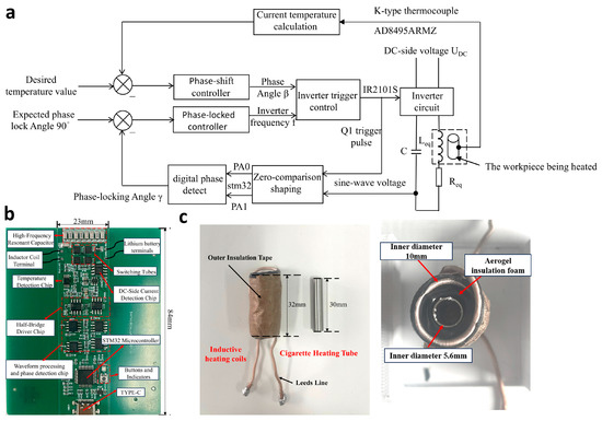 Figure 3a shows the overall structural framework of the small induction heating control system, and Figure 3b shows the layout of the PCB circuit board for the specific application of this structure in the design of heating non-combustible smokers. The PCB circuit board has a length of 84 mm and a width of 23 mm, and it is mainly divided into two modules: temperature control and frequency modulation (FM)-phase-locked control. The temperature control process requires power regulation, and power regulation requires FM-phase-locked control. Therefore, during the system operation, the two modules coordinate with each other to control the duty cycle and frequency of the NMOS drive signal, respectively. The NMOSs are controlled through the half-bridge driver chip IR2101S, into which the MCU signal is input.