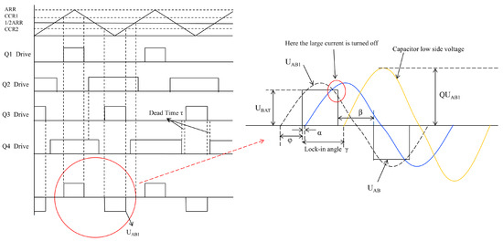 When the phase shift is β, by adjusting the frequency, the zero-crossing point of IAB is kept lagging behind the rising edge of the drive pulses for Q1 and Q3 by a very small phase-shift angle α. The purpose of this adjustment is to provide sufficient time for the NMOS commutation and to approximately achieve zero-current switching. Considering that the voltage across the capacitor always lags behind the current IAB by 90° in phase, this paper uses the voltage across the capacitor to phase-lock IAB with a phase-lock angle of 90°. By frequency modulation and phase locking, Q1 and Q3 can be maintained in a soft turn-on and high-current turn-off state during the power adjustment process, as shown on the right side of Figure 6.