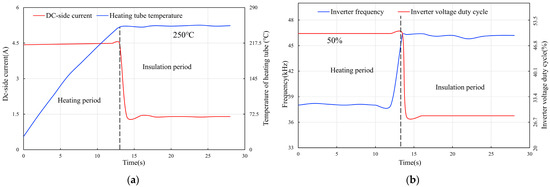 A pure ferrous heating tube with a 0.1 mm wall thickness and a 1.17 mm coil wire diameter was used to examine the effect of capacitance on the operating performance of the control system. Figure 12a illustrates the impact of increasing capacitance on the DC-side current and inverter frequency of the system during both the heating and temperature-holding periods. Figure 12b depicts the variation in the heating rate of the heating tube and the power losses of Q1 and Q4 during these periods as the capacitance increases (Q2 and Q3 show symmetrical losses). It shows that as the frequency decreases, both Q1 and Q4 exhibit a reduction in losses during the holding period. However, due to the increased current during heating, losses slightly increase in this phase. Since the temperature-holding period is significantly longer than the heating period, losses during holding play a major role in the NMOS temperature rise. Therefore, increasing the capacitance overall helps reduce NMOS temperature-rise losses. Additionally, increasing the capacitance initially enhances the heating rate of the heating tube. However, once the capacitance exceeds a certain value, further increases lead to diminishing returns in heating rate enhancement.