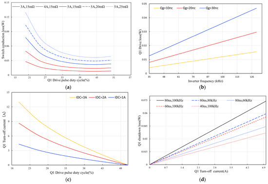 The analysis of various loss factors for NMOSs Q1 and Q4. (a) The conduction loss of Q1 varies with the duty cycle of its driving voltage for different IDC and RDS(on). (b) The trend of the NMOS’s driving loss with increasing inverter frequency f under different gate total charges Qg. (c) The variation in Q1’s turn-off current with the driving voltage duty cycle for different IDC. (d) Q1’s turn-off loss changes with the turn-off current under different toff and f.