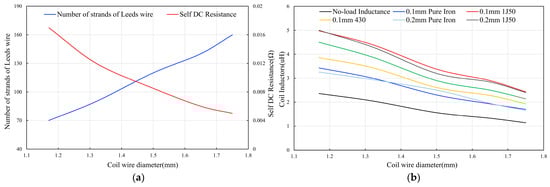 Figure 10a shows the trend of the number of strands included in the Leeds wire and the DC resistance of the coil as the wire diameter increases. The DC resistance of the coil decreases gradually from 0.017 Ω to 0.005 Ω as the wire diameter increases from 1.17 mm to 1.75 mm. At the same time, the increase in the number of Leeds wire strands suppresses the skin effect and thus reduces the AC resistance of the coil. Therefore, at the same frequency and magnitude of the current through the coil, a larger wire diameter will effectively reduce the coil’s own losses.