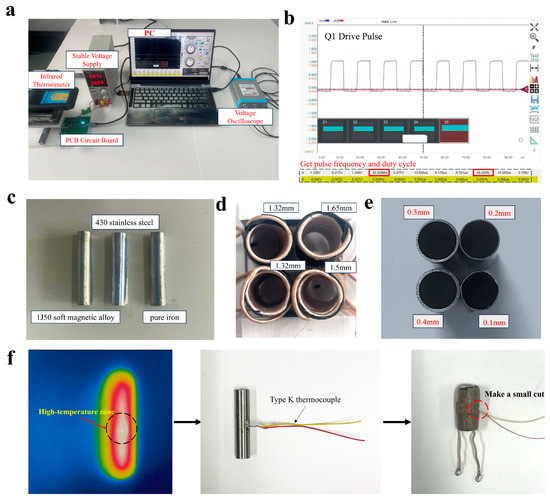 The experimental setup. (a) The experimental platform for the performance testing of a small induction heating control system. (b) The output waveforms from the oscilloscope. (c) Three experimental materials: iron, 430 stainless steel, and 1J50 iron–nickel soft magnetic alloy. (d) Induction coil wires with different diameters. (e) The appearance of different wall thicknesses of heating tubes. (f) The temperature distribution of the heating tube and the arrangement of K-type thermocouples.