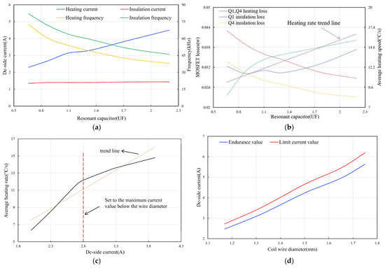 Experimental results under initial circuit conditions with a coil wire diameter of 1.17 mm and a 0.1 mm thick pure iron heating tube. (a) The DC-side current IDC and inverter frequency f during the heating and temperature-holding periods as the capacitance increases. (b) NMOS Q1 and Q4 losses and the heating rate of the heating tube during the heating and temperature-holding periods as the capacitance increases. (c) The trend of the average heating rate of the heater with increasing DC-side current. (d) The current withstand and limit values of coils correspond to the DC-side current in relation to the coil wire diameter.