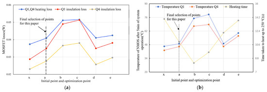 Figure 15a compares the NMOS loss values at six selected points. Figure 15b contrasts the heating time required for the heating tubes and the temperature rise of NMOSs after 5 min of system operation at these points. The results reveal that the temperature rise at each point correlates closely with calculated loss values. Throughout, Q1 shows a higher temperature rise than Q4. Points b and c exhibit notably higher NMOS temperature rises, with Q1 exceeding 75 °C at point c. Point e falls in the middle, while points a and d show similar, relatively small temperature rises. Point x shows the smallest temperature rise. Regarding the heating time, point b requires the shortest duration, followed by points c, a, and d, while points x and e require the longest. It can be seen that points b and c have very fast heating rates but, at the same time, introduce a large NMOS temperature rise to the system, and point X has a small NMOS temperature rise, but due to the coil’s own loss, its battery efficiency is low and the heating time is long. Only point a has good performance in both the heating rate and NMOS temperature rise at the same time. Therefore, to improve the comprehensive performance of the control system, point a is selected as the best optimization point of this system, which has a faster heating rate and relatively small loss.