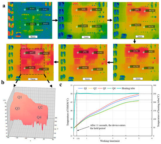 The thermal analysis of NMOSs and the heating tube in the induction heating system. (a) Infrared temperature distribution of NMOSs after running the device for 1 min, 2 min, 3 min, 4 min, and 5 min, respectively. (b) A 3D thermogram of NMOSs after running the device for 5 min. (c) The trends of the NMOSs as well as the heating tube temperature with the device running time.