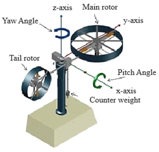 A TRMS consists of a main rotor and a tail rotor, as shown in Figure 1. The twin DC motors that power these rotors are connected to a voltage input from an electrical unit beneath the TRMS. This electrical unit is a communication switch between the TRMS and the computer and contains an emergency shutdown unit. The twin rotors are connected to DC inputs that produce torques τ1 and τ2, which turn the rotors.