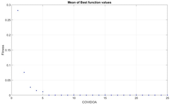 Sk refers to the kth generated protein, P is the parent solution, and D is the problem dimension (the number of variables in each solution). The frameshifting results represent a new protein sequence. The COVIDOA’s cost is noted in Figure 4 as an example of minimizing cost (fitness) values for the above metaheuristic algorithms over iterations.