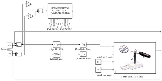 The reason for the z-domain conversion is that the TRMS is connected to a computer during real-time operation. This transformation ensures that the data flow correctly between the TRMS and the computer, the difficulties encountered in the s domain are overcome, and efficiency is increased. The selected sampling time was first simulated on the computer, and then the controller parameters were found and run in the real system. Since the Ts (sampling time) value was quite small, the parameters were obtained on the computer, and experimental studies were carried out. In this way, metaheuristic algorithms can cope with the sampling time against the real system.