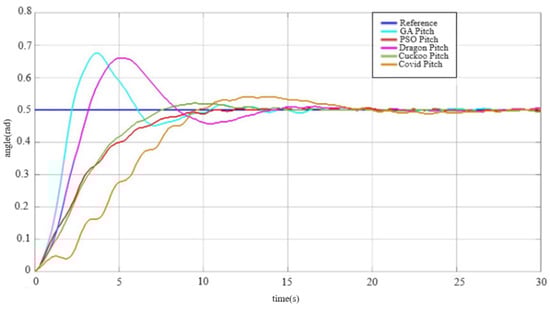 Pitch angle response with particle swarm, genetic, dragonfly, cuckoo search, and coronavirus optimization algorithms.