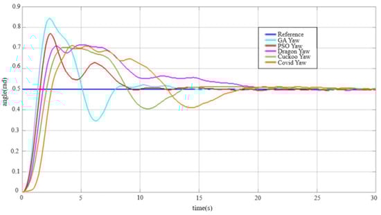 Yaw angle response with particle swarm, genetic, dragonfly, cuckoo search, and coronavirus optimization algorithms.