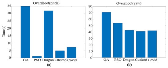 Bar graph of % overshoot: (a) pitch angle; (b) yaw angle.