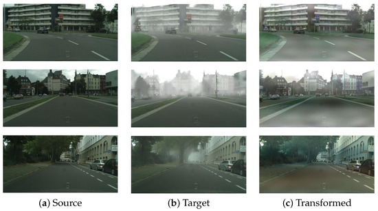 Figure 6. Fourier transform on “Severe Weather” setting and “Real to Art” setting. For “Severe Weather” setting, the original image is well converted to its foggy version. For “Real to Art” setting, Fourier transfer adaptation is limited to converting the original car to match the color of the target car. - The consistent teacher–student framework. We further analyze the importance of our consistent teacher–student framework. Results are shown in Table 6. We replace our consistent teacher–student framework with the MT and evaluate it on all datasets (up to 1.6%). Varying degrees of performance drops are observed on all datasets. The results show that our model is more robust after enforcing the consistency between the classification and the localization branches in both supervised and unsupervised ways.