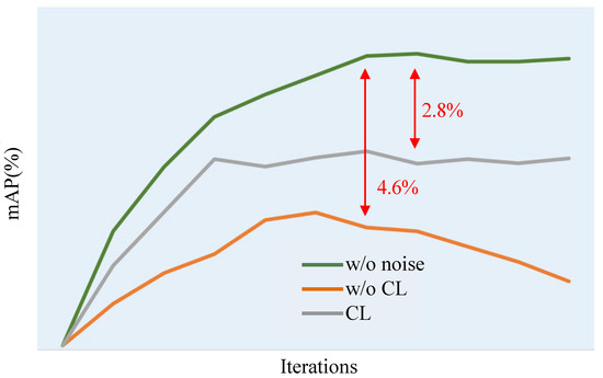 Figure 7. Impacts of pseudo-label noise on Clipart1k performance. Models w/o contrastive learning suffer great performance drops caused by noise in pseudo-labels. Our model introduces contrastive learning to help resist the noisy pseudo-labels and reduce performance instability.