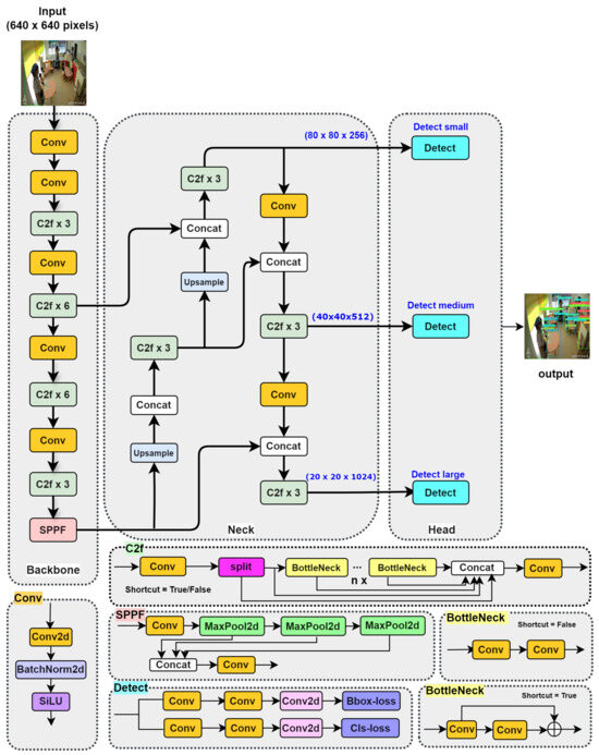 (1) Input: The input component’s purpose is to receive and prepare the input image data. Pre-processing steps commonly involve image augmentation techniques such as mosaic, scaling, mixup, etc. Choosing the appropriate image augmentation technique for the dataset results in a considerable improvement in the performance of the model. Furthermore, the image size needs to be normalized to 640 × 640 pixels according to the YOLOv8 input standard.