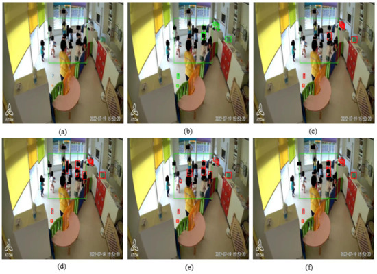 Visualized only small objects (a) image input (b) ground truth (green) and the inferences (red) of (c) YOLOv8s; (d) YOLOv8-v1; (e) YOLOv8-v2; (f) YOLOv8s-NE.