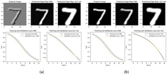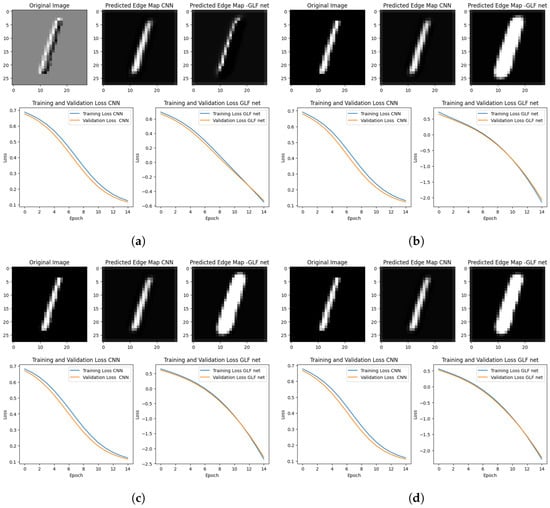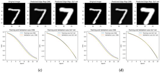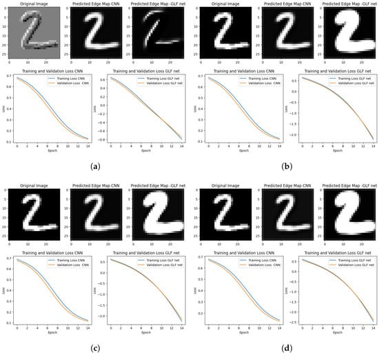 This section examines GLFNet with the same model without the Grünwald–Letnikov fractional step and discusses the training and validation performance of our Grünwald–Letnikov fractional neural network (GLFNet) model intended for edge detection. To evaluate the model’s learning behavior and capacity to generalize to new data, we examine the important metrics—loss and accuracy—across the epochs. The training dataset was iterated over a predetermined number of epochs using fractional orders , , , and to examine their effects on convolutional neural networks. represents the standard integer-order convolution, serving as a baseline. The selected fractional orders near 1 (, , and ) were chosen to evaluate how different degrees of fractional differentiation influence model performance. This range was selected to balance theoretical insights with empirical observations of performance improvements and practical considerations related to computational efficiency. The model was modified based on the optimization of the chosen loss functions for each fractional order.