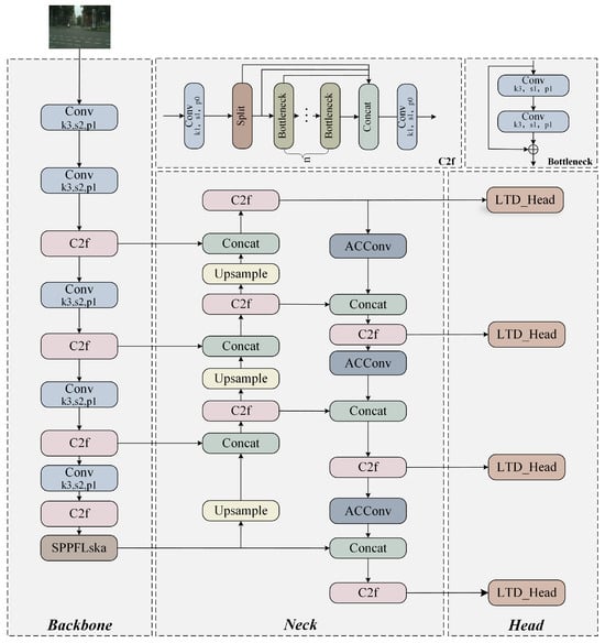 The four primary parts of the DS_YOLO algorithm are the input, backbone, neck, and head. The DS_YOLO is shown in Figure 2. The feature extraction and feature fusion networks were redesigned based on the characteristics of small targets. Specifically, we developed a dedicated detection layer tailored for dim and small objects, enhancing the fusion of information across different stages. To ensure the model’s generalization capability and robustness, we retained the detection layer for large objects. This method preserves the accuracy of general size object detection while simultaneously increasing the accuracy of small object detection. Next, a novel convolutional module, ACConv, is designed to extract representative channel features for deeper computation, with the remaining channel features serving as supplementary information for subtle details. This not only ensures detection accuracy but also drastically lowers the computing burden and quantity of parameters. For the misalignment between target classification and detection tasks, the LTD_Head is proposed as a lightweight dynamic task alignment detection head. It utilizes interactive features to align classification and detection tasks, thereby improving detection accuracy. The model becomes lighter by dramatically reducing the number of parameters through the utilization of shared convolution. Lastly, an innovative design is applied to the SPPF module to create the SPPFLska module, addressing semantic conflicts at the pixel level that arise when combining different-sized pooling layers. This prevents the loss of important feature information.