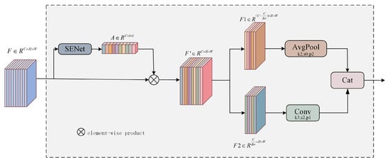The structure of the ACConv module. SENet utilizes a channel attention mechanism. After computing the weights for each channel to obtain , it selects the top-ranked channels for convolutional operations, while the remaining channels undergo average pooling. Subsequently, the features from these two parts are separated, processed, and concatenated to generate a new feature representation.