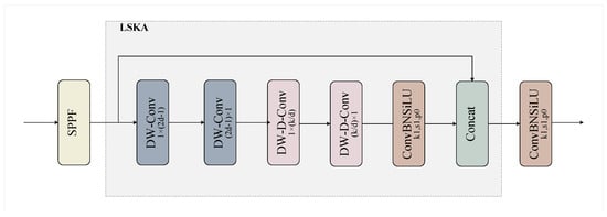 Therefore, this method introduces the large separable kernel attention module [36], which splits the depth convolutional layer’s 2D convolution kernel into cascaded one-dimensional convolution kernels in the horizontal and vertical directions. This eliminates the need for extra blocks and permits the use of deep convolutional layers with huge convolution kernels in the attention module, and reduces computational complexity and memory usage. This module helps the model dynamically adjust the weights of feature maps, facilitating the model to focus more on feature regions that are more crucial for the job at hand. Combining the spatial pyramid pooling method allows for feature extraction on various scales, increasing the model’s capacity for perception. This enables it to better capture important information at different scales and positions within images, thus raising the accuracy and robustness of the model. The computation for the parameter volume of the attention calculation module LSKA is Equation , indicating that this is a low-cost attention mechanism.