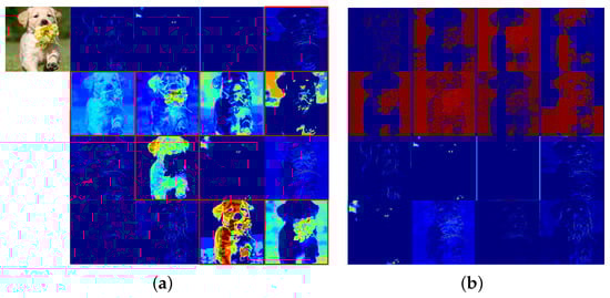 The top-left image represents the original picture. (a) The feature maps inputted into ACConv, with the feature maps encircled in red boxes selected as representative features. (b) The feature maps outputted by the ACConv module.