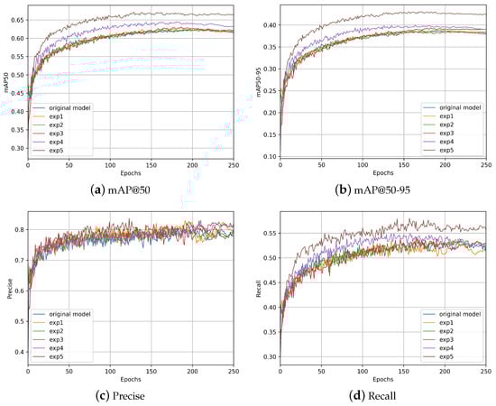 The YOLOv8n algorithm serves as the baseline in this section. Several improvement strategies proposed in this paper are evaluated through ablation experiments, aimed at gaining a deeper understanding of their effects on detection performance. There are six groups of ablation experiments carried out, using , , , , and as metrics for evaluation. In these experiments, ✓ indicates the adoption of the respective method. The results of the ablation experiments performed on the CityPersons dataset are shown in Table 3.