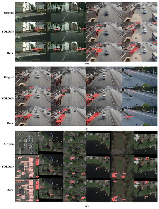 (a,b) Comparison of dim and small pedestrian detection results. (c) Comparison of remote sensing small object detection results.