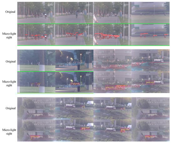 The micro-light data are collected by a micro-light detector in the smart micro-light sight. The response wavelength range of this detector is 380–940 nm, encompassing a broad spectrum from visible to near-infrared light. This allows the images to retain rich detail and contrast even under micro-light conditions, although the images may still appear somewhat dim. Additionally, due to the long focal length and narrow field of view of the smart micro-light sight, the targets in the collected images tend to be small and dim. In this section, we used our models trained on the previously mentioned public datasets to detect images collected by the smart micro-light sight. Figure 10 shows the detection results of DS_YOLO on images captured by the smart micro-light sight. It is evident that the ability of detection for small and dim targets against complex backgrounds is excellent, with virtually no missed detections, even in densely populated scenes.