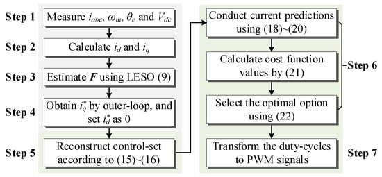 - Step 1: Measure the information of the stator currents (ia, ib, and ic), machine speed (ωm), rotor electrical angle (θe), and DC-link voltage (Vdc).