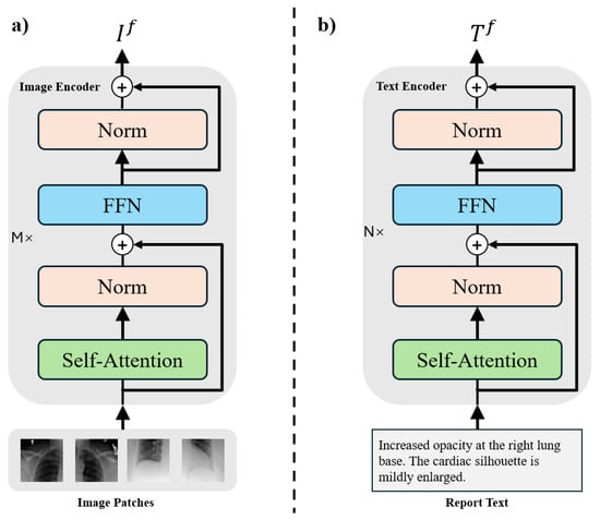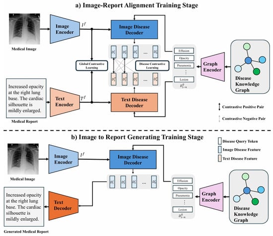 In this paper, we propose a disease-knowledge-enhanced fine-grained image–text alignment for automatic radiology report generation named DKA-RG. To further facilitate the semantic alignment of radiology images and texts, our framework constructs contrastive learning methods at the global and disease levels, respectively. Specifically, we encode images and texts with Vision Transformer [15] and BERT [16] models, respectively, to obtain high-dimensional vector representations of both. Global contrastive learning is then constructed by treating matched images and reports as positive sample pairs and mismatched sample pairs as negative sample pairs. Global contrastive learning can bring semantically related image–text pair encoding closer and push away semantically unrelated image–text pairs encoding farther, thus realizing semantic alignment. The semantic alignment of radiology images and report text still has deficiencies by global alignment alone, so we use the graph attention network (GAT) [17] to obtain a series of disease tokens based on the medical disease knowledge graph. Meanwhile, we construct a disease decoder network based on Transformer [18]. We take disease tokens and the image/text features as input to the disease decoder to query the disease features in the image and text. Since there is semantically consistent disease information in the image and the corresponding report text, we construct disease-level contrastive learning. Specifically, the disease query features of the same disease query token in the image and the text, respectively, are used as positive sample pairs, and the disease query features obtained from different disease query tokens are used as negative sample pairs, so as to promote the semantic alignment of diseases in the image and the text. With the alignment at both global and disease levels, our medical image encoder can better extract the medical features in images. Finally, we construct a Transformer-based [18] report decoder to generate the radiology report based on the image features obtained from the image encoder and disease features from the disease decoder.